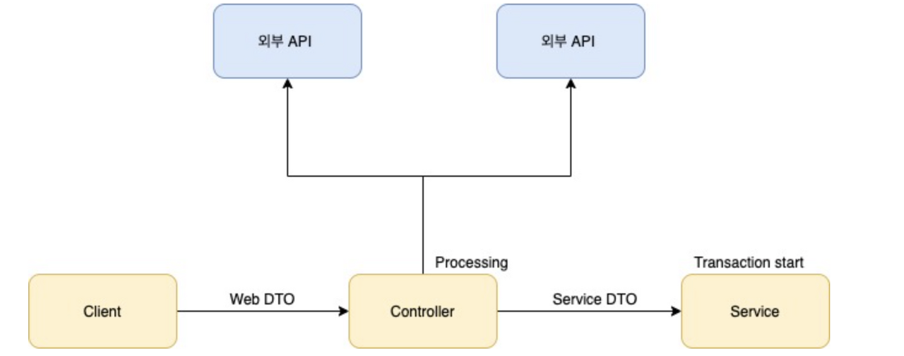 참고로 위에 예제에서 Controller에서 (Controller-Service 사이에 중간 레이어를 두고 하는 경우 포함) 외부 API를 조회하는 이유는 Service에서 해당 작업을 수행하는 경우 트랜잭션과 무관한 작업이 트랜잭션 내에 포함되기 때문에 DB 타임아웃과 같은 이슈가 발생할 수 있기 때문이다.