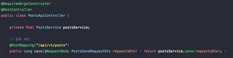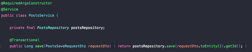 위 예제 코드의 테스트 코드는 Posts라는 엔티티를 생성하는 코드이다. 이를 위해 맨 처음에 PostsSaveRequestDto라는 Dto 객체를 빌더 패턴으로 생성하고 Dto를 컨트롤러에게 던져준다. 컨트롤러는 해당 Dto를 다시 Service에게 넘겨주고, Service 단에서 JPA를 이용하여 생성된 객체를 저장한다.