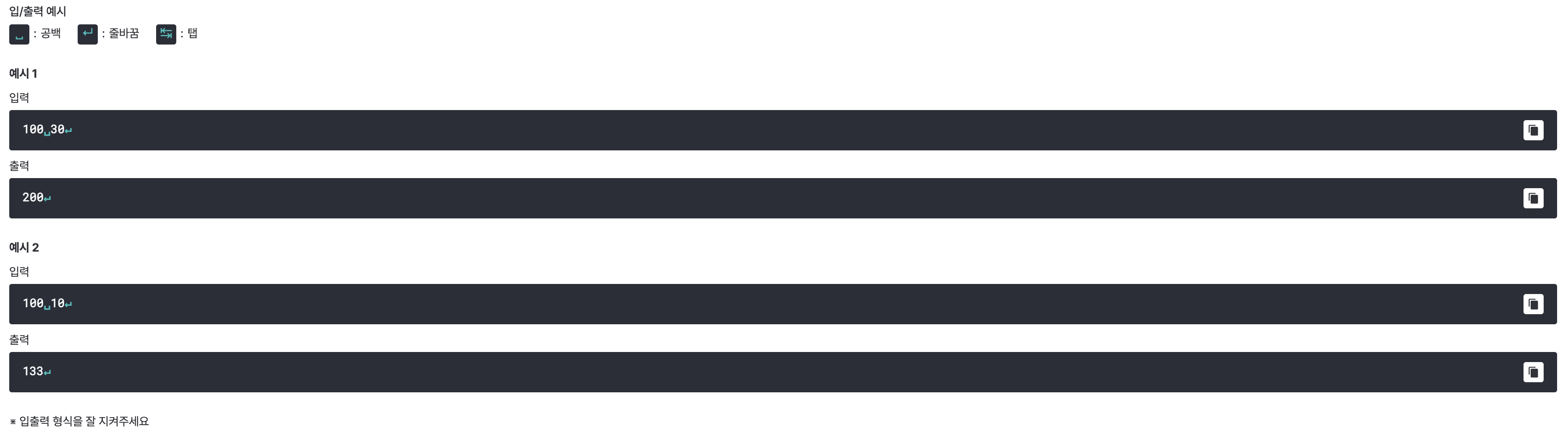 대신, 모두 정수로만 입력이 주어지지만 30으로 나누면서 소수점이 발생할 수 있기 때문에 소수점 이하의 값은 버리는 과정만 해주면 된다.