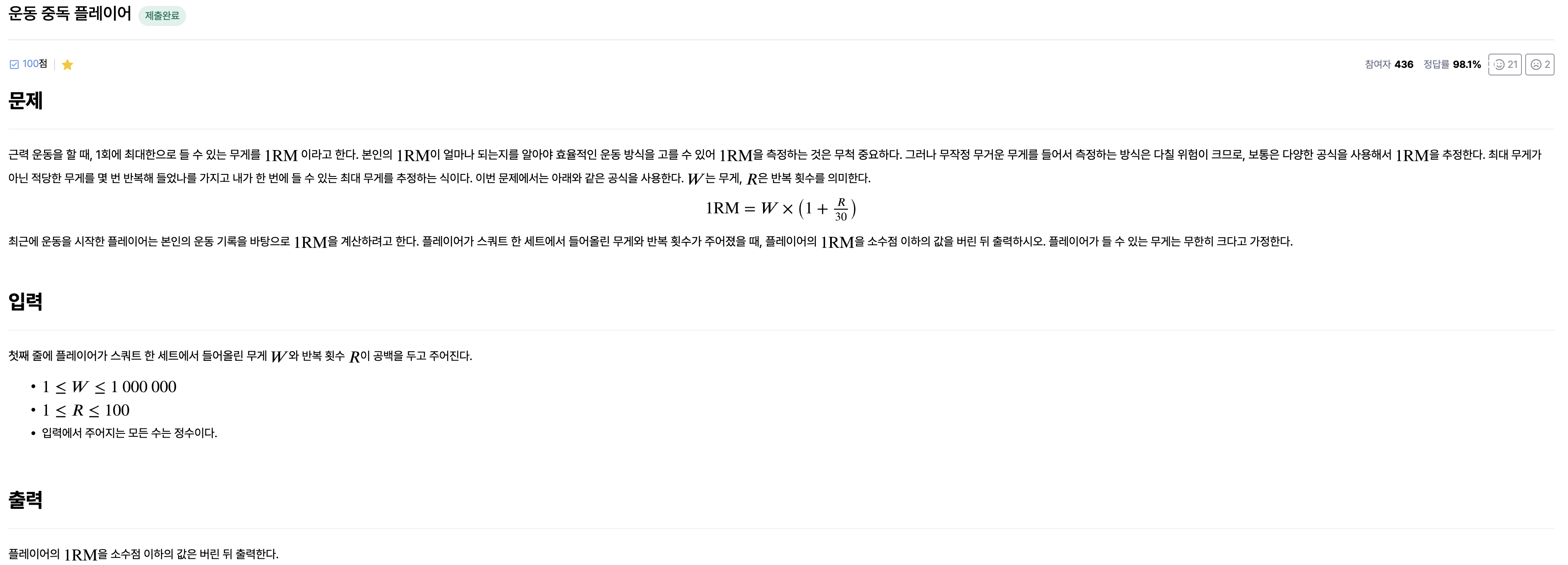 공백을 기준으로 무게와 반복 횟수가 들어오고 1RM을 구하는 식은 주어져 있으니 식을 활용하여 단순 값만 도출해내면 된다.